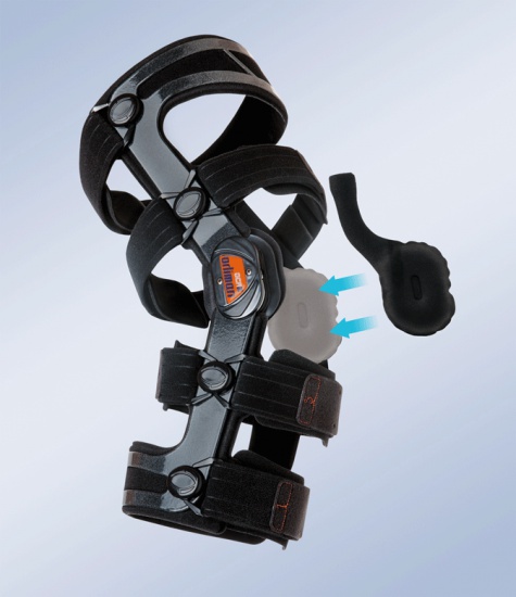 Боковые пластины соединены между собой динамическим полицентрическим шарниром с системой "flexion-extension-LOCK". Для регулировки диапазона угла сгибания и разгибания в замке используются съемные металлические клинья.