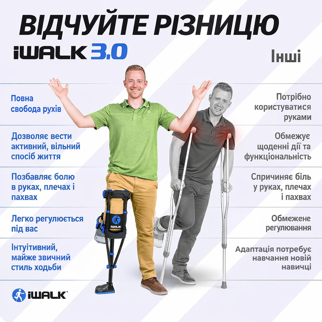 Костыль iWALK – революционное решение для тех, кто не может опираться на одну ногу. Конструкция позволяет ходить без участия рук, выполнять ежедневные дела и сохранять мобильность. Благодаря коленной платформе, мягким ремням и интуитивной регулировке пользователь получает свободу движений и комфорт в период реабилитации. Подходит для подъема и спуска по лестнице, использования на улице и в помещении при любой погоде. Мягкая дышащая подкладка и ремни с цветовой кодировкой обеспечивают удобную посадку и простую настройку без инструментов.
