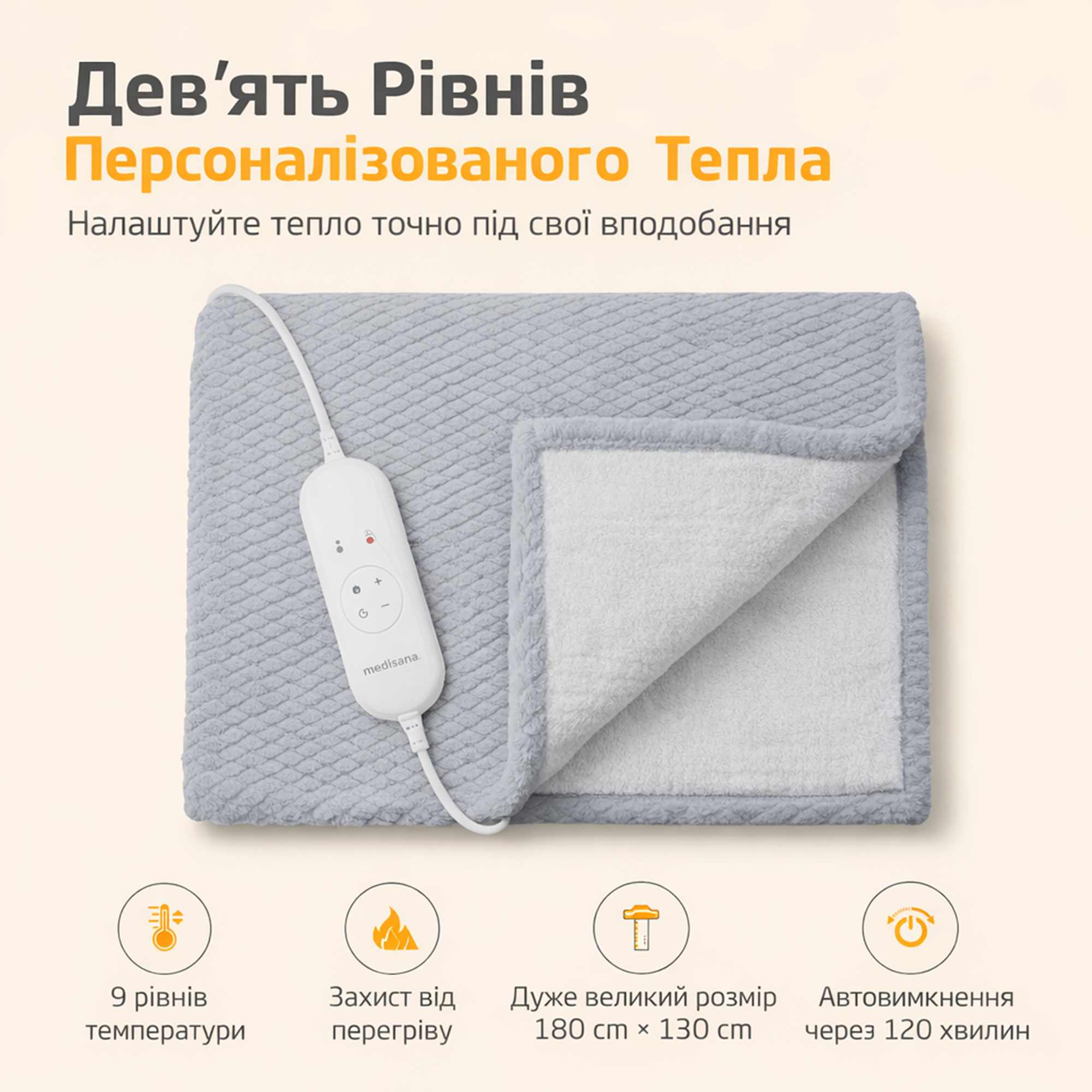 Электрическое одеяло с подогревом180*130 см с 9 уровнями нагрева 120 Вт Medisana HB 416, светло-серое