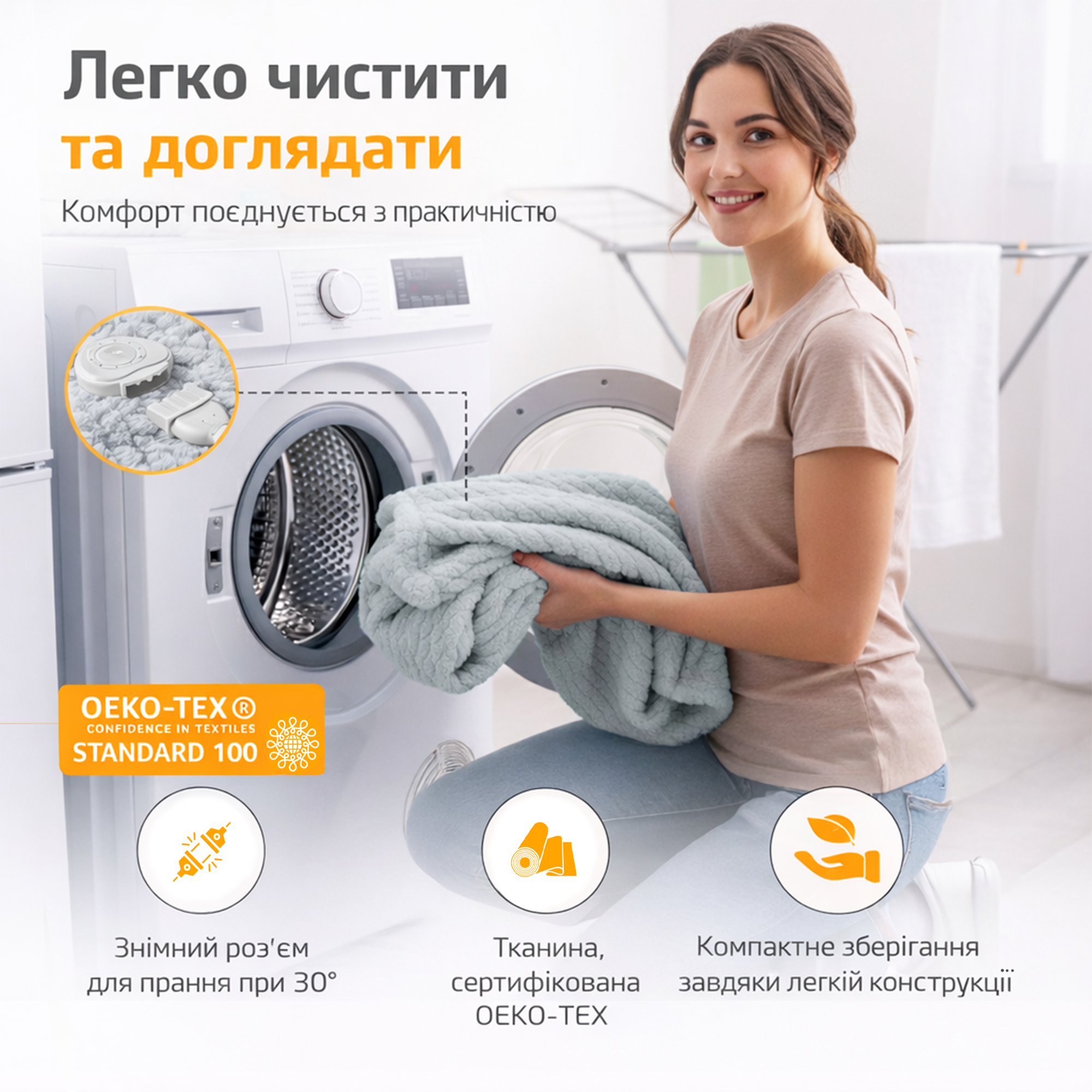 - Возможность стирки после отсоединения блока управления
