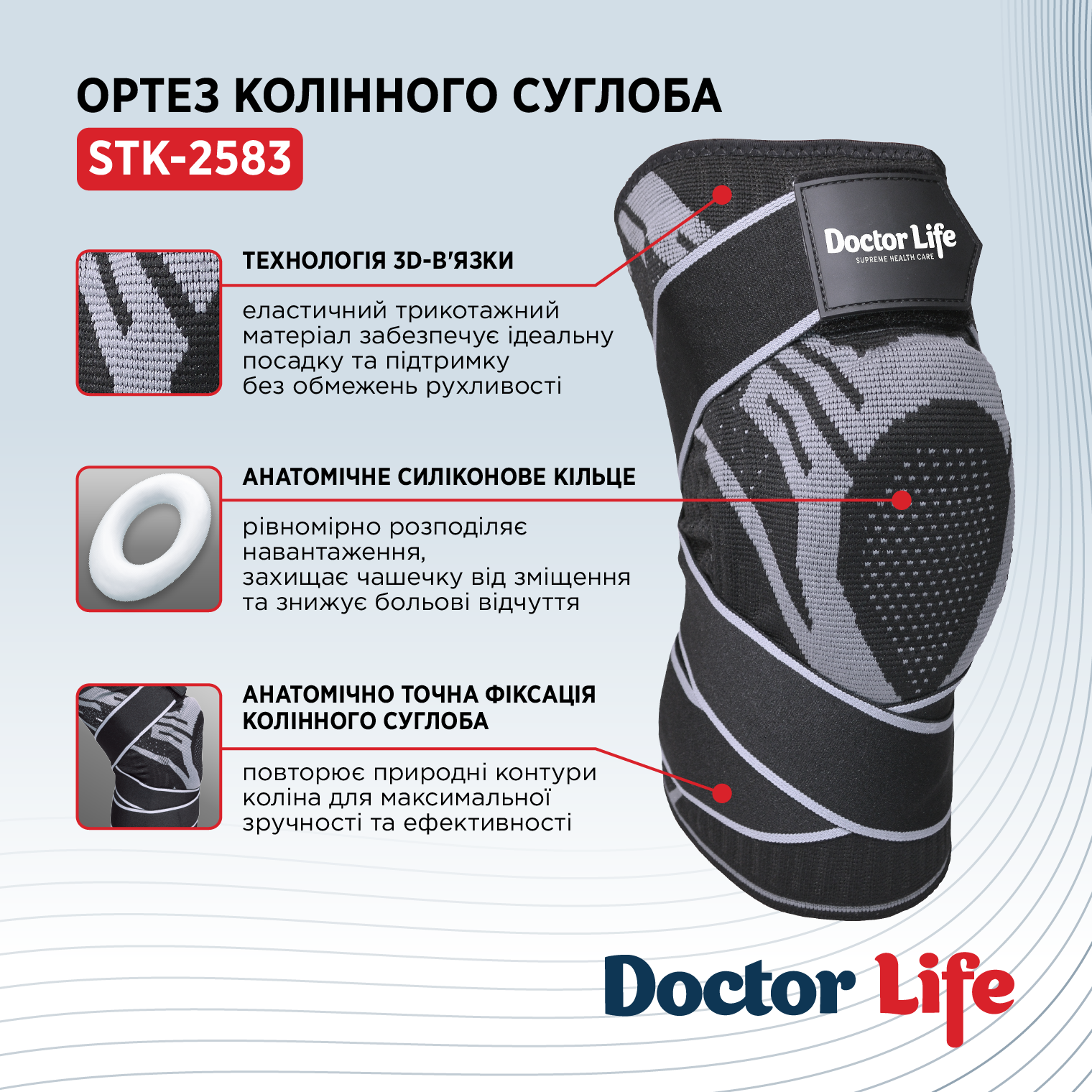 Doctor Life STK-2583 — медицинский ортез коленного сустава с усиливающими элементами, предназначенный для дополнительной поддержки и ограничения нежелательных движений. Рекомендуется в составе комплексной консервативной терапии, в период реабилитации после травм, а также в пред- и послеоперационный период. Ортез располагается так, чтобы зона надколенника и подколенной ямки соответствовали анатомическим вырезам, а ремни застегиваются после проверки правильного расположения изделия.