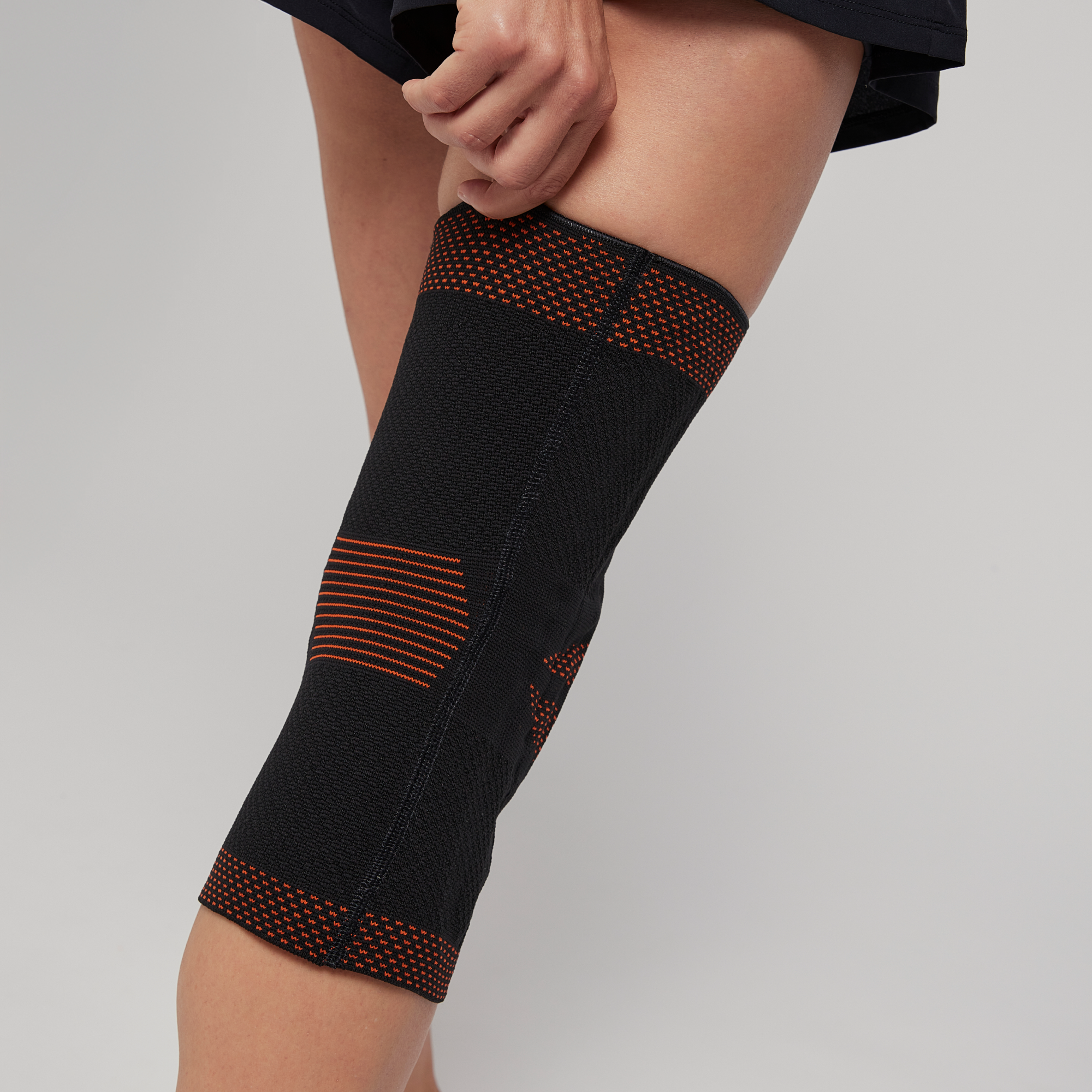 Наколінник виготовлений з інноваційного матеріалу на основі 3D в'язки, матеріал вирізняється особливою точністю розподілу компресії та має відмітні компресійні властивості — 3 клас компресії 20-36 мм.рт.ст. Міцний і практичний, чудово пропускає повітря, зберігає свої властивості після багаторазового прання й інтенсивних навантажень. Парапатетарне кільце з техногелю гарантує надійну фіксацію колінної чашечки. У верхній частині кільце ширше для фіксації зв'язки чотириголового м'яза стегна.