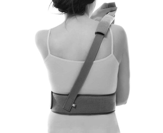 Інструкція із застосування: 1. Помістіть і зафіксуйте поясну частину на рівні ребра. Покладіть руку поруч із тулубом, вигнуту в лікті. Установите браслет на место. 2. Зафіксуйте лямку на поясній стрічці на спині та надягніть на травмоване плече. 3. Протягніть ремінець через пряжку, закріплену на браслеті. За потреби затягніть та встановіть місце. 4. Зафіксуйте лямку, що охоплює кінцівку вище ліктя. Акуратно притисніть лікоть до поясної частини. Це прикріпить лікоть і поясну частину один до одного. 5. К налокотнику пришит узкий пояс. Затягніть його та закріпіть на поясній частині.