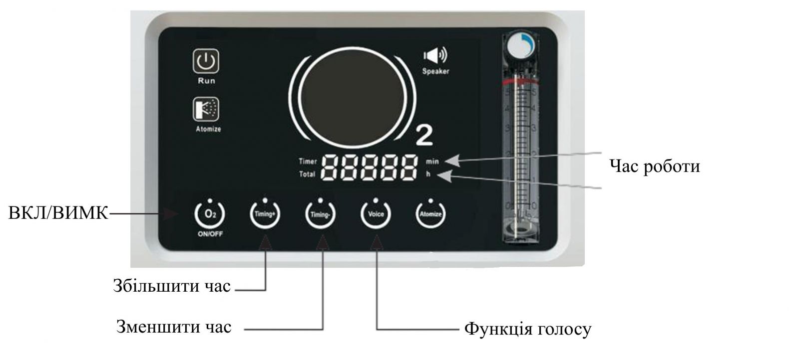 - На великому дисплеї задається програма — час сеансу, потужність потоку кисню, що містить газ