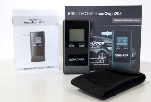 Алкотестер алкофор 205, мундштуки — 5 шт., інструкція з експлуатації, дві батарейки "аааа", чохол, свідчення про реєстрацію.