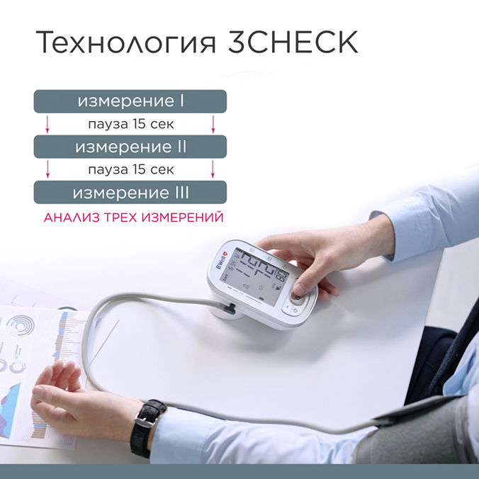 Тонометр виробляє 3 послідовні вимірювання з інтервалом 15 секунд. Потім виріб проводить аналіз вимірювань за спеціальним алгоритмом і виводить максимально точний результат.