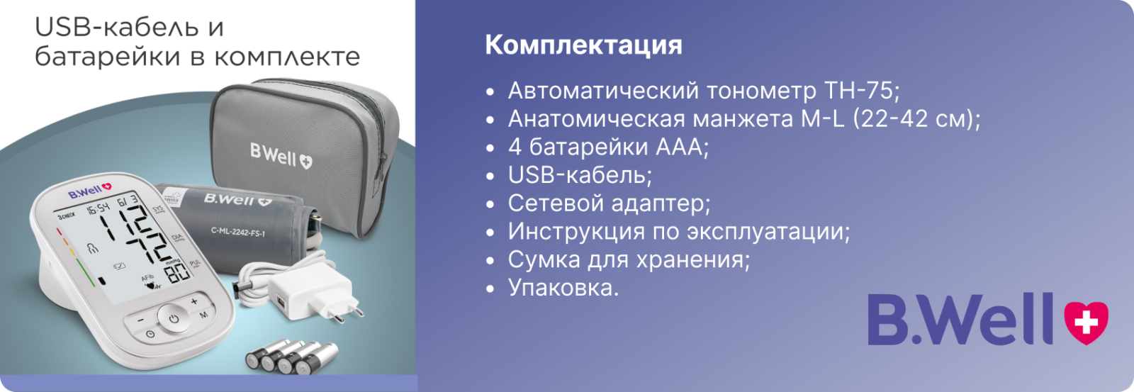 B.Well TH-75 зручно використовувати завдяки автоматичному вимірюванню під час накачування манжети, що робить процедуру швидшою та комфортнішою. Широка анатомічна манжета підходить для більшості користувачів, а індикатори правильного положення допомагають уникнути помилок під час вимірювання.